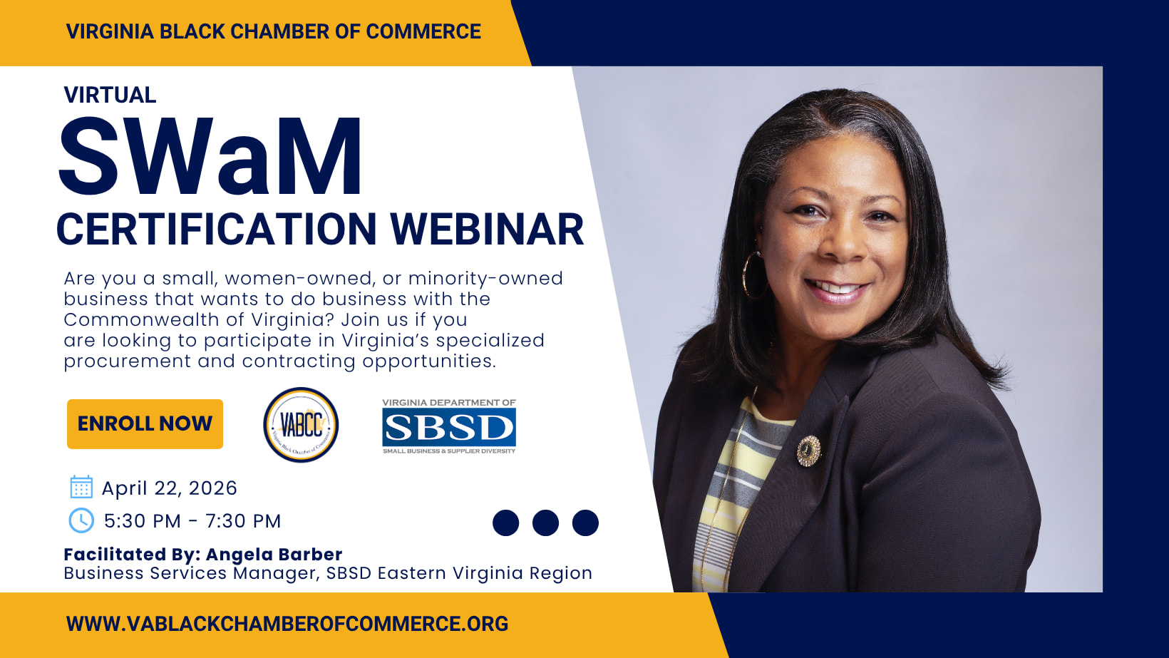The Commonwealth of Virginia wants to do business with you and increase participation of small, women-owned, and minority-owned businesses. This workshop will cover the SWaM Program and certification/designation types, the online application process, the required documents needed to apply, and how to use the certification to do business with the Commonwealth (intro to eVA, Virginia's Online Procurement Portal).