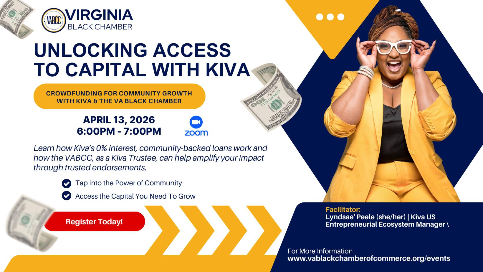 Learn how Kiva’s 0% interest community-backed loans up to $15,000 work and how the VABCC, as a Kiva Trustee, can help amplify your impact through trusted endorsements. Whether you're a business owner seeking funding or an ecosystem leader supporting entrepreneurs, this session will show you how to tap into the power of partnership and community to fuel business dreams—together.