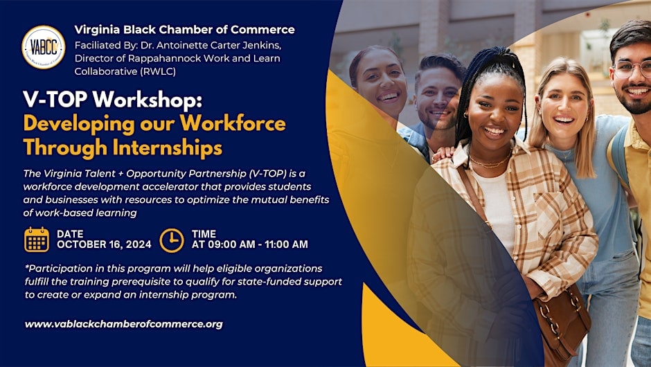 The Virginia Talent + Opportunity Partnership (V-TOP) is a workforce development accelerator that provides students and businesses with resources to optimize the mutual benefits of work-based learning. Our local V-TOP representative, the Rappahannock Work and Learn Collaborative, is offering a free, online workshop designed to help organizations learn how to develop high-quality, mutually beneficial internship experiences. Participation in this program will help eligible organizations fulfill the training prerequisite to qualify for state-funded support to create or expand an internship program.