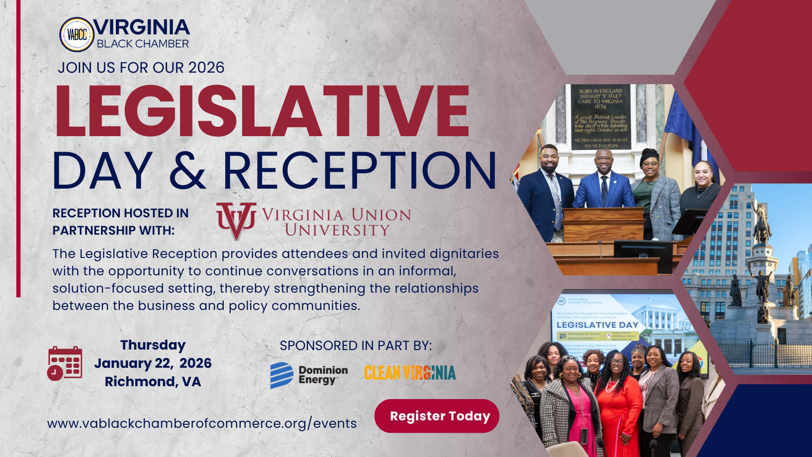 Join the Virginia Black Chamber of Commerce (VABCC) for Advocacy Day & Legislative Reception, a signature convening focused on elevating the voices of Black-owned and underrepresented businesses while strengthening relationships with policymakers across the Commonwealth.