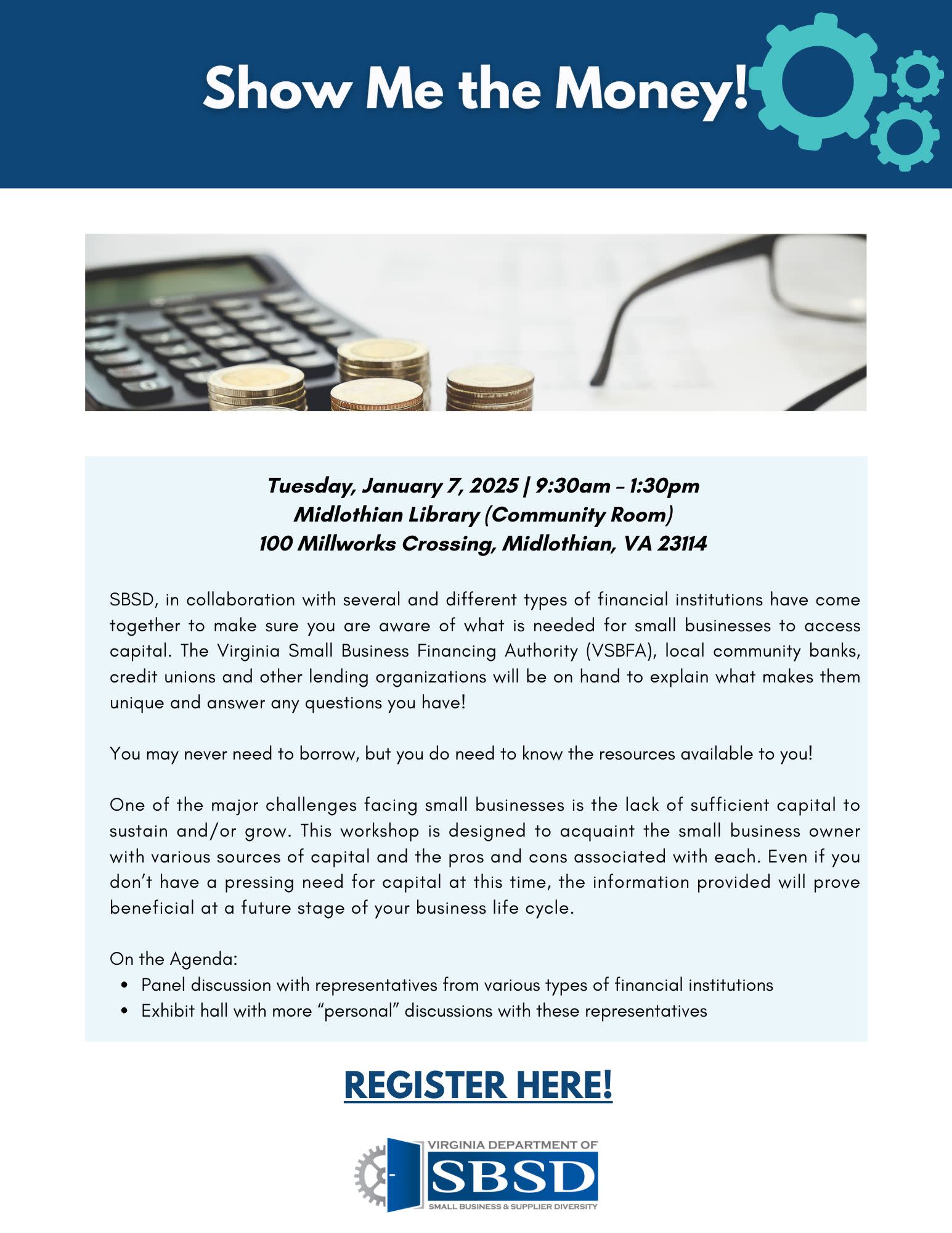 SBSD, in collaboration with several and different types of financial institutions have come together to make sure you are aware of how small businesses can access needed capital (one of the leading causes blocking business success). The Virginia Small Business Financing Authority (VSBFA), local community banks, credit unions and other lending organizations will be on hand to explain what makes them unique and answer any questions you have!